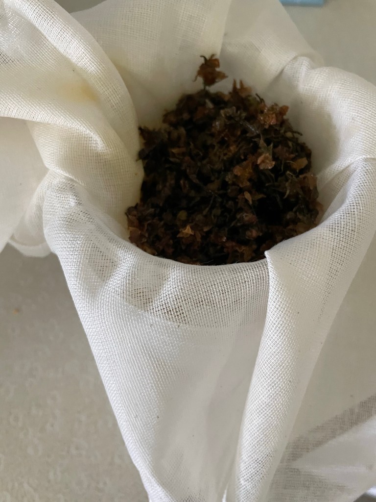 - Then Strain oil from jar, using a cheese cloth. ( make sure to squeeze out all that oil) discarding plant material.