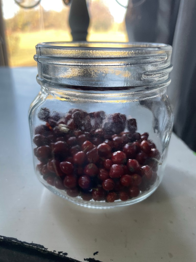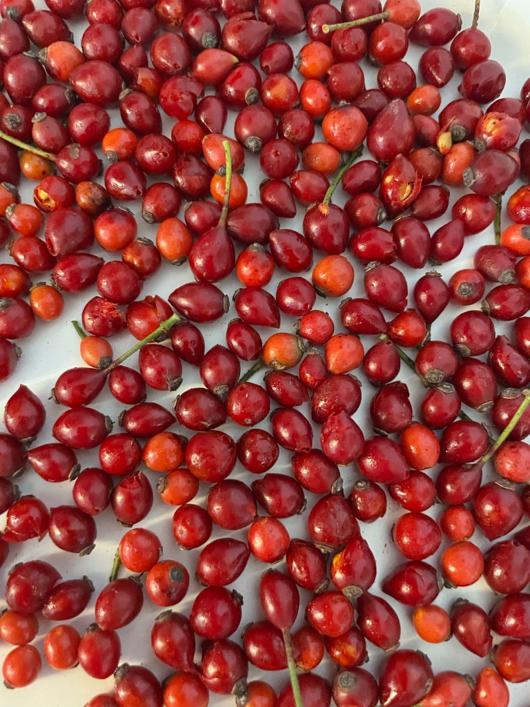 I have read that Rose hips are best harvested when they are bright red and soft but not mushy. They should come off the branch easily and if they are slightly wrinkled that’s okay. You can also harvest them while they are still in the orange-ish stage but they will not be fully ripened and will be more tart.