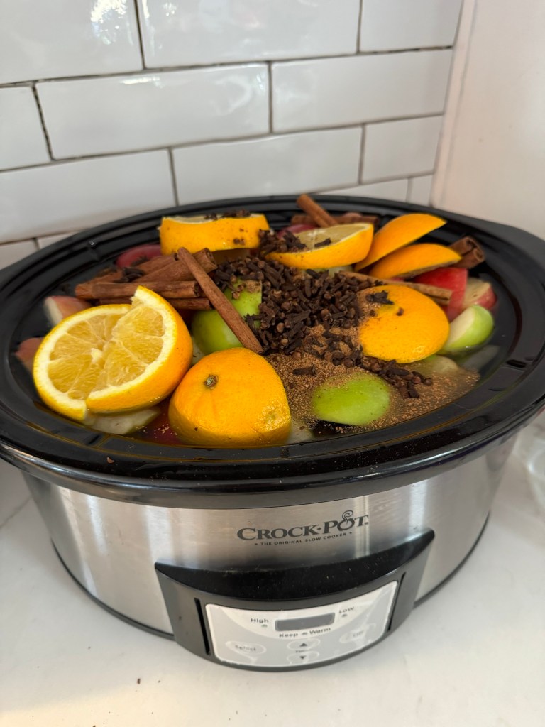 Add fruit, water and all spices with the exception of the brown sugar into the crockpot and heat to low for 6 hours. Enjoy the wonderful fall scent this gives off!